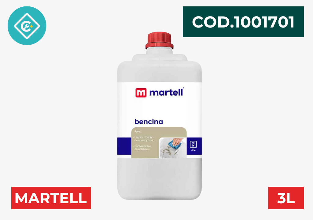 1001701 bencina 3 L MARTELL✔️Uso principal: Disolvente y limpiador de superficies, especialmente útil para eliminar grasas, ceras, pegamentos y residuos de adhesivos.✔️Aplicaciones: Limpieza de objetos metálicos, herramientas y preparación de superficies antes de pintar.✔️PRESENTACION: POR UNID ?ENVIOS A TODO EL PERU ☎️PARA MAYOR INFORMACIÓN DÉJANOS TU MENSAJE 994612661